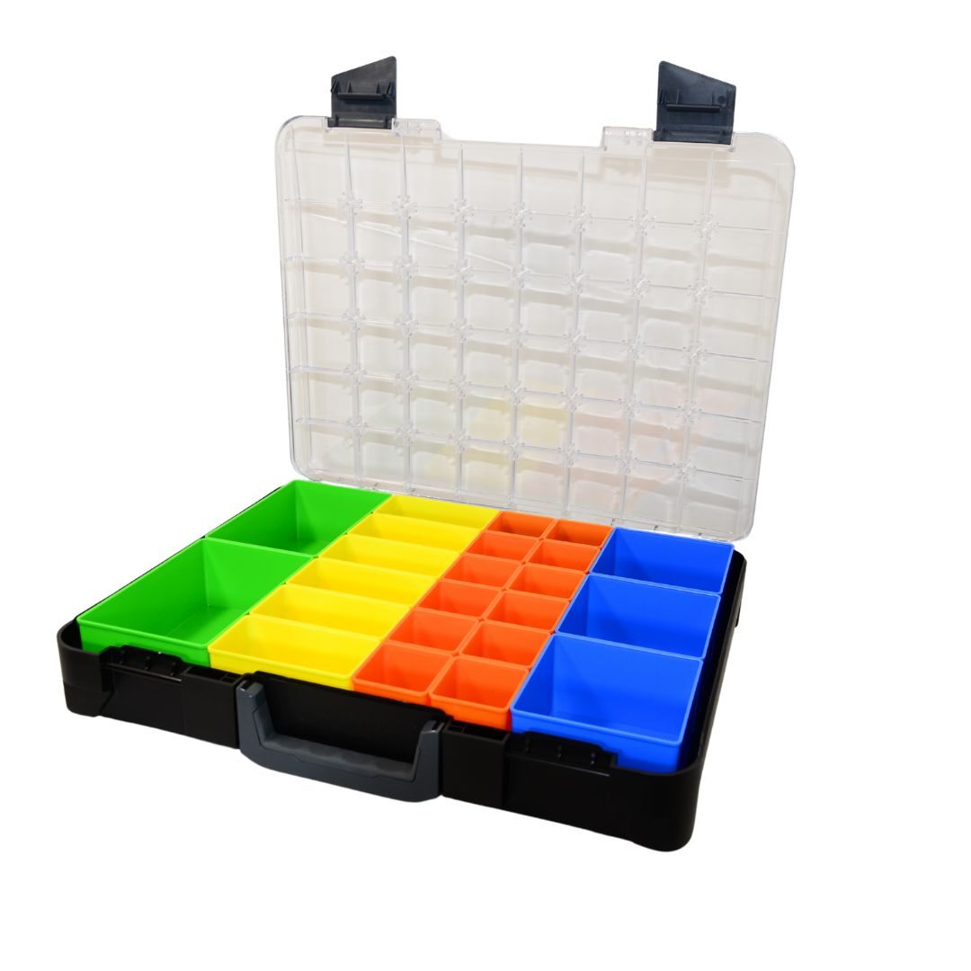Unser leichter Kleinteilekoffer besteht aus doppelwandig schlagfestem PP-Kunststoff und besitzt einen transparenten und ebenfalls unzerbrechlichen Deckel für eine perfekte Übersicht. Dank robuste Verschlusslaschen einfach auch mit Handschuhen zu öffnen. Der Sortimentskoffer von KompaVan ist frei mit Einsatzkästen bestückbar und fügt sich perfekt auf unsere Koffertablare oder Kofferauszüge in der Infinity Fahrzeugeinrichtung ein. Die übersichtliche und immer mobile Kleinteilelösung.