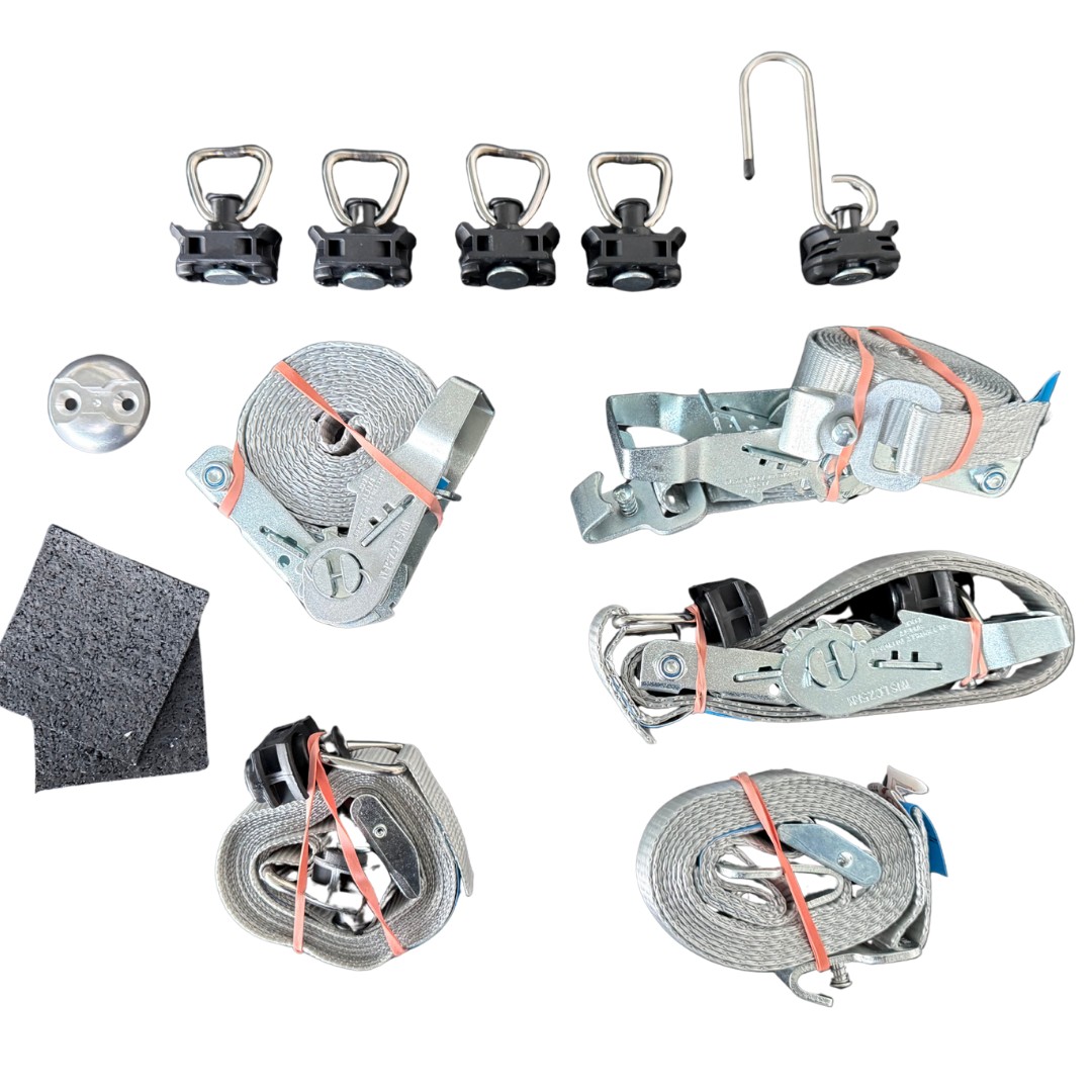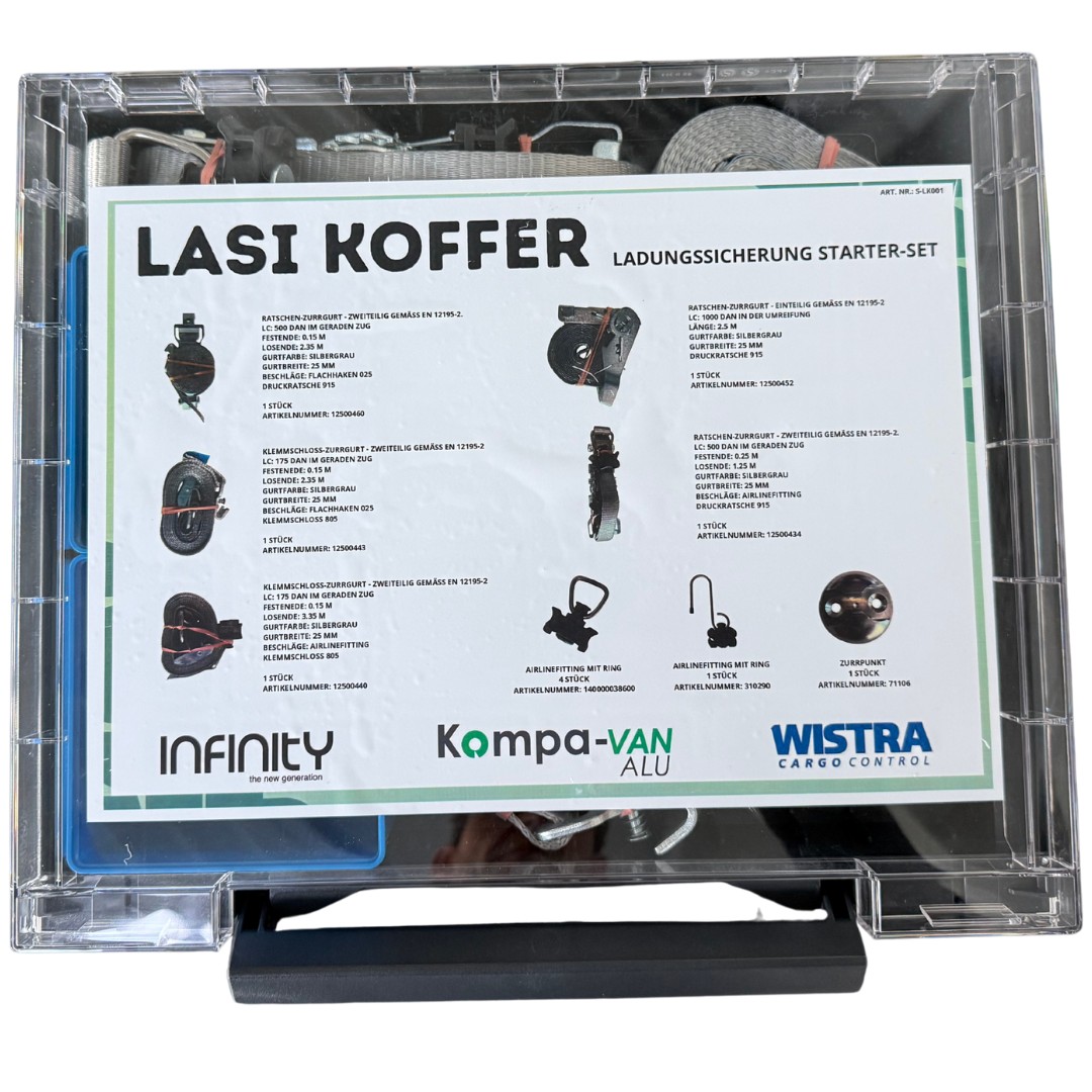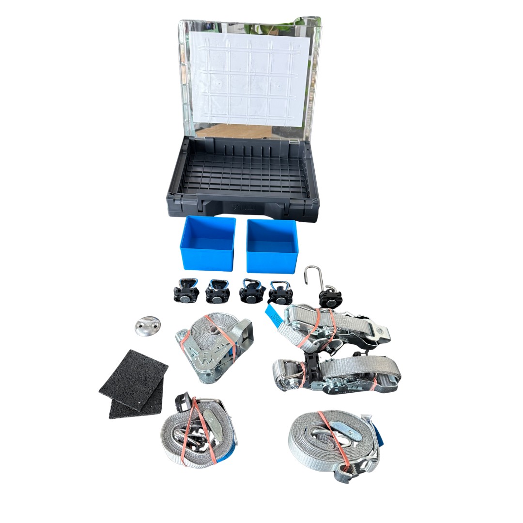 Das Team KompaVan hat sich überlegt, welche Sicherungselemente hauptsächlich verwendet werden und für eine flexible und sichere Ladungssicherung im Laderaum des Transporters benötigt werden. Um Ihnen die Entscheidung abzunehmen haben wir dazu ein flexibles Set in Form unseres neuen Lasi-Koffers zusammengestellt. Die Sicherungselemente funktionieren unabhängig davon, was Sie bereits an Zurrpunkten, Zurrösen und Zurrschienen im Fahrzeug verbaut haben. Dank Systemübergreifender Endbeschläge der im Set enthaltenen Zurrgurte können die Gurte im Zusammenspiel mit separaten Fittingen und Haken an bestehenden Zurrösen im Fahrzeug, an unterschiedlichen Fittings im Airline System und direkt an Airline-Zurrschienen angewendet werden. Alles ist in einem kompakten Koffer verstaut und so im Laderaum immer griffbereit. Der Koffer kann individuell mit der gewünschten Anzahl an Fittings, Zurrpunkten und Antirutschmatten ergänzt werden. Alle verwendeten Elemente kommen vom deutschen Qualitätshersteller, sind genormt und zertifiziert.