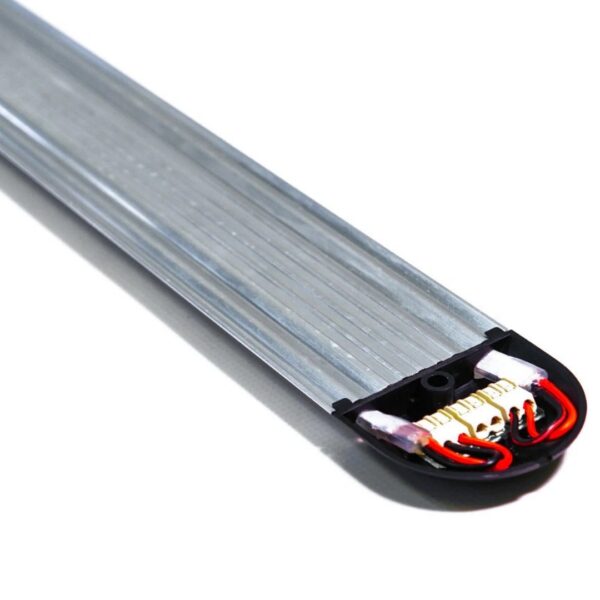 Elektrischer Anschluss: Der Anschluss erfolgt durch ein 2-adriges Kabel mit 2x 0,5 mm² Querschnitt. Bei Bedarf können die Kappen ebenfalls verschraubt werden. Dazu werden die Kappen mit einem 4,3 mm Bohrer von der Rückseite aufgebohrt. Hinweis: Die maximale Spannung des LED Streifens beträgt 12.4V. Sollte das Bordnetz des Fahrzeugs nicht auf diese Spannung begrenzt sein, ist ein Spannungsbegrenzer zu verwenden, um ein Überhitzen der LED-Schiene zu vermeiden.